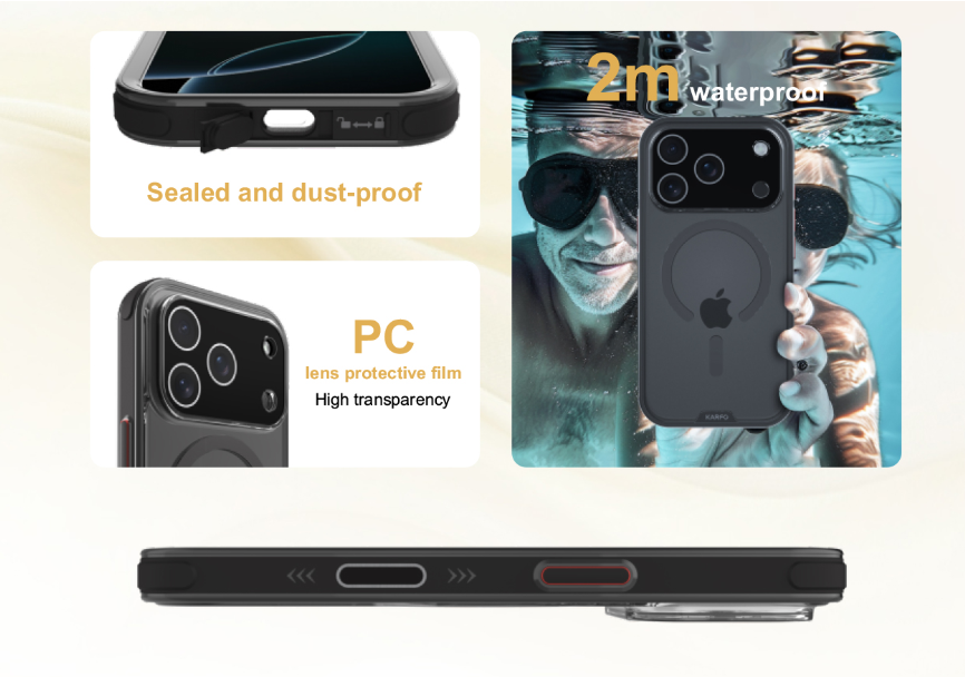 Specially designed for the iPhone 17 series. With IP68 waterproof protection, it safeguards your phone up to 2 meters deep, making it perfect for swimming, snorkeling, and rainy-day photography. The fully sealed design also provides dustproof and shockproof defense, ensuring comprehensive protection for your device in any outdoor environment. Whether you’re capturing underwater moments or exploring the great outdoors, this case is an essential companion for reliable, worry-free shooting.